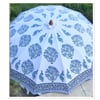Pure cotton parasols for an English garden. They have a hand-blocked decorative upper canopy and a complementary hand-blocked decorative inner lining. The metal pole with a hinge allows them to be easily angled. They are light enough for one person to move easily so is ideal to take to a temporary setting such as a picnic or cricket match, as well as over a lunch table or pool bed. Base not included.